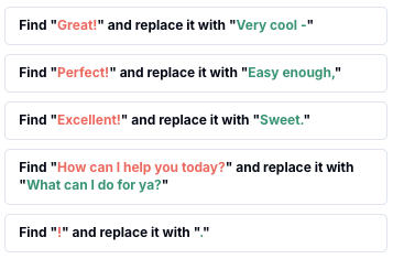OverviewA big issue when using AI is that it sounds like - well - AI… So, you can take advantage of find and replace to swap out verbiage to your preference.ExampleIf you are looking for more casual language but your AI keep saying things like “Excellent!”, “Sounds good!”, etc. you can use find and replace to take that language and replace with with “Cool.”, “That sounds about right.”, etc.